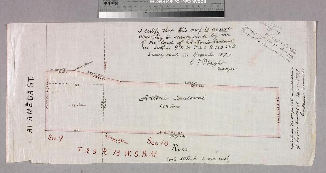 East from Alameda St., sec. 9-10, T. 2 S.R. 13 W. S.B.M.. Color highlighting, distances, property owners; pencil calculations, acreage. Title transfer info. Title supplied by cataloger.