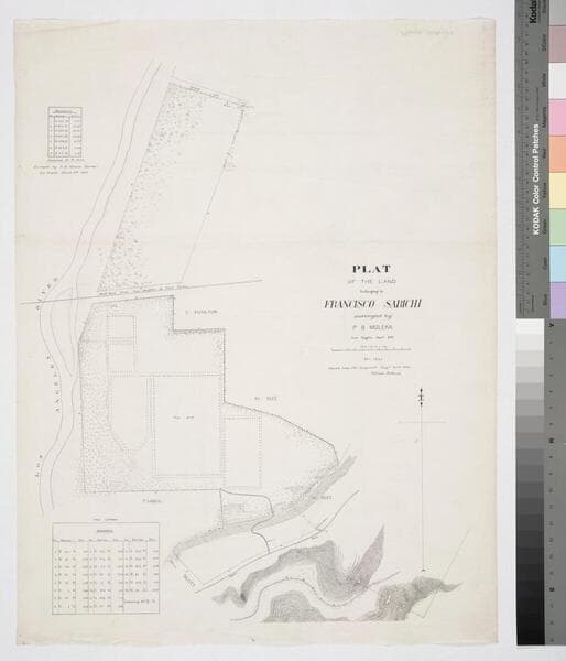 Plat of the land belonging to Francisco Sabichi [east bank Los Angeles River, Rose (Kuhrts) St. to Mission Road, showing structures and surface detail, with courses, copied 1883 by Alfred Solano]
