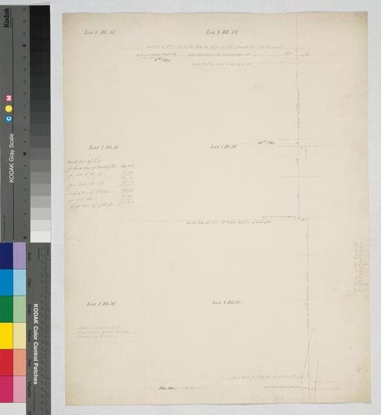 West from Pearl St. beyond Figueroa, between Eighth and Ninth St., shows subdivision, lot owners, block numbers; color highlights; references to other surveys; pencil calculations. [Title from verso]. Alt title supplied by cataloger.