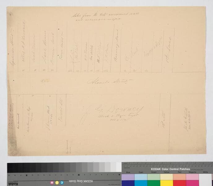 [Numbered "3" in upper right corner]. "Copied from the City Assessment Roll and the assessors maps". Includes Marchesault St.. Parcel owners include Los Angeles Orphan Asylum, Matthew Keller; calculations re: footage from Macy to Aliso St.. Title supplied by cataloger.