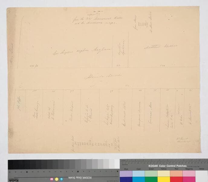 [1st four maps are grouped together: three are numbered 2, 3, 4 in upper right corner]. Highlights in black grease pencil; distances, parcel owners; pencil calculations. Los Angeles Orphan Asylum; Estate of Pelanconi, Los Angeles City Water Co., Marchesault St.. Title supplied by cataloger.
