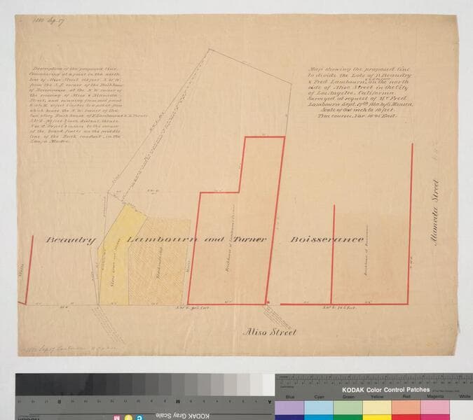 Proposed line to divide the Lots of P. Beaudry and Fred Lambourn & W.E. Turner on the north side of Aliso Street [west from Alameda St., showing structures and names of lot owners, with field notes]