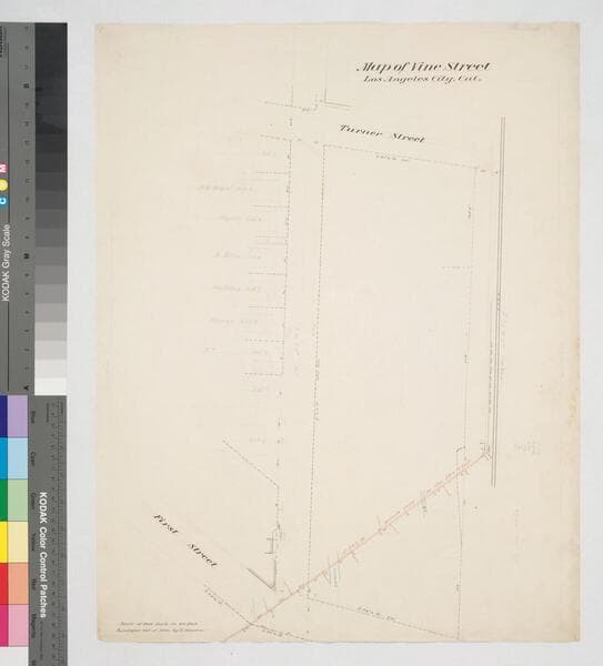 Map of Vine Street [to Alameda St., Turner to First St., showing structures, frontages, and names of lot owners on west side of Vine St. (for sewer assessment?)]