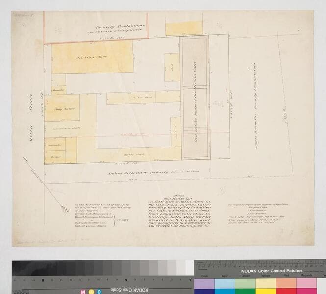 To Los Angeles St., showing structures, lot owners. Surveyed at the request of S.A. de Cardona. Color highlighting, some lot dimensions indicated. Alt title supplied by cataloger.