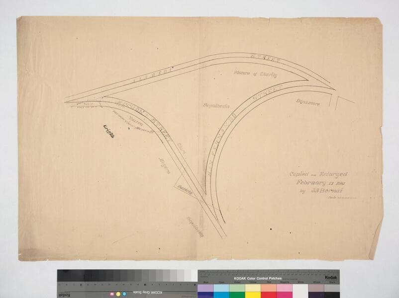 With centerline courses and parcel owners: Griffith, Ybarra, Sabichi, Meyer. Two sheets glued together; calculations. Title supplied by cataloger.