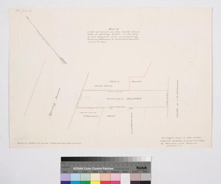 To Los Angeles St., showing structures, lot owners. Surveyed at the request of S.A. de Cardona. Color highlighting, some lot dimensions indicated. Alt title supplied by cataloger.