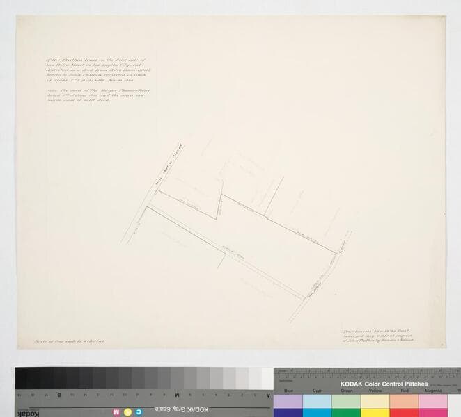 Survey made at the request of H.D. Barrows as described in a Deed from J.R. Scott to Wm. Wolfskill. Color highlighting; bearings, distances; southern city limit; one structure. Alt title supplied by cataloger.