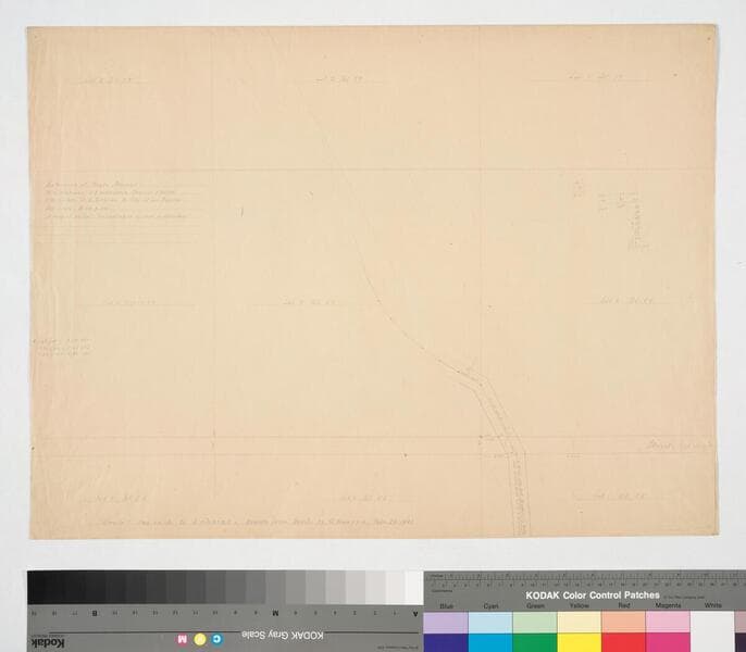 Blocks 58 & 59, Hancock's Survey, showing surface detail: hachures, color & pencil annotations, calculations. Courses & distances; structures. At the request of Mrs. J.E. Hollenbeck. Alt title supplied by cataloger.