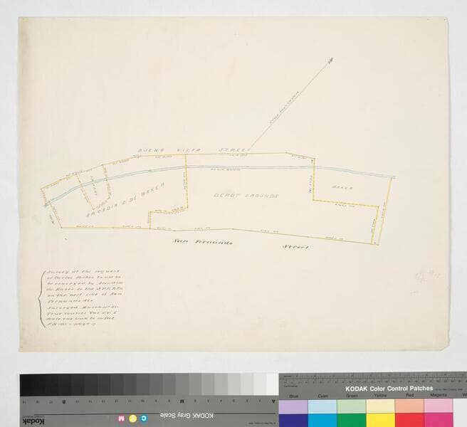 Buena Vista St., showing dwelling house; color highlighting, Main Zanja; distances, bearings; pencil annotations. Alt title supplied by cataloger.