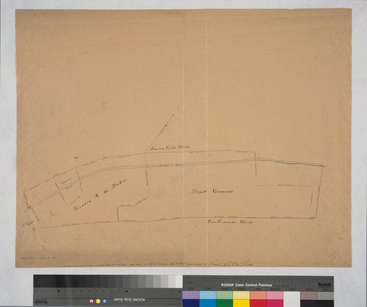 On the west side of San Fernando Str. to Buena Vista St.. Survey requested by Carlos Forbes. Color highlights, courses, distances with Zanja Madre, Depot Grounds. Alt title supplied by cataloger.