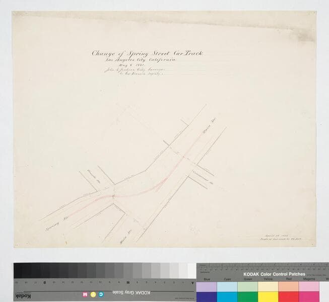 Shoelgens & others' parcels along Seventh St. east of San Pedro St., showing structures; color highlighting, courses, distances. [Paper watermark: Southworth 1882 Linen Bank]. Alt title supplied by cataloger.