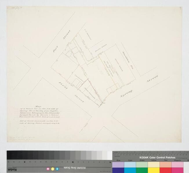 North from Arcadia St., showing structures, lot owners (incl. Pio Pico); courses, distances, color highlighting. Alt title supplied by cataloger.