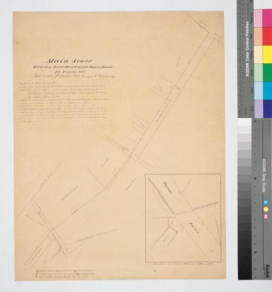 Main Sewer btween [sic] First Street and Ogier Lane [along Los Angeles St., showing names of parcel owners, with inset of sewer junction at Ogier Lane, field notes, and notes] [2 pieces, also including copy of preceding map]