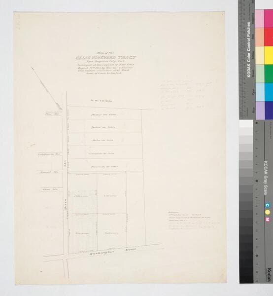 P. 27 of stapled document, "The Celis Vineyard Tract..." as well as loose documents following; showing courses, distances; tracts bordered by Main & Pine Streets. Title supplied by cataloger.