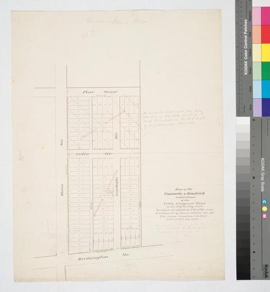 Along Santee St. and Maple Ave. from Washington to Pine St.; sketch copied from LA County records; courses, distances, parcel numbers; also indicates Brodrick & Consuelo subdivisions. Paper watermark: Royal Linen Ledger. [see also Maps 406, 473, 476, 565, 647, 651, 700]. Alt title supplied by cataloger.