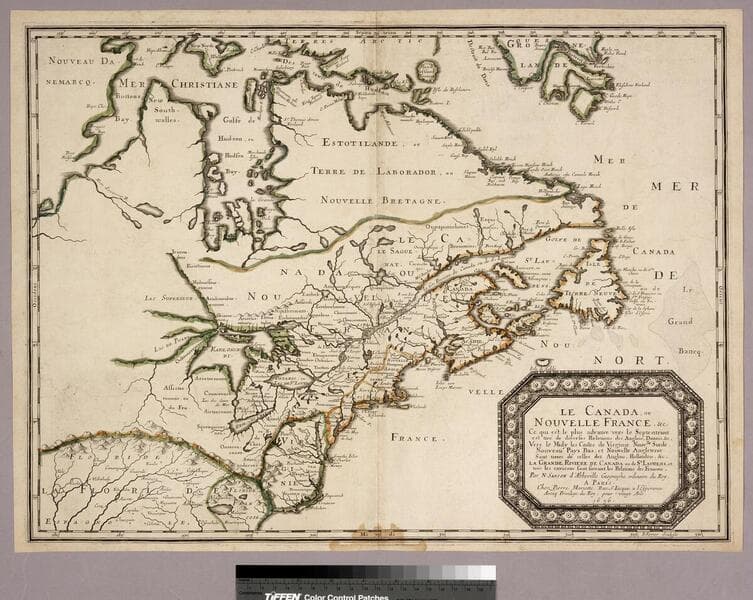 A map based on information from Samuel de Champlain and other explorers plus the imagination of the mapmaker. The Arctic Ocean connect directly with Hudson's Bay and is only a short distance above Lake Huron. Sales sticker attached under mat. "ou sont La Nouvelle France Le Nouvelle Angleterre La Nouvelle Holande La Nouvelle Svede La Virginie &c. Avec le Nations voisines et autres Terres Nouuellement decouvertes Sunant les Memoires de P. du Val, Geographe du Roy" Relief: pictorial. Graphic Scale: Leagues. Projection: Cylindrical. Watermark: Circular with grapes. Printing Process: Copper engraving. Verso Text: MS notes: 1527 15 28 1500462926 A-61.