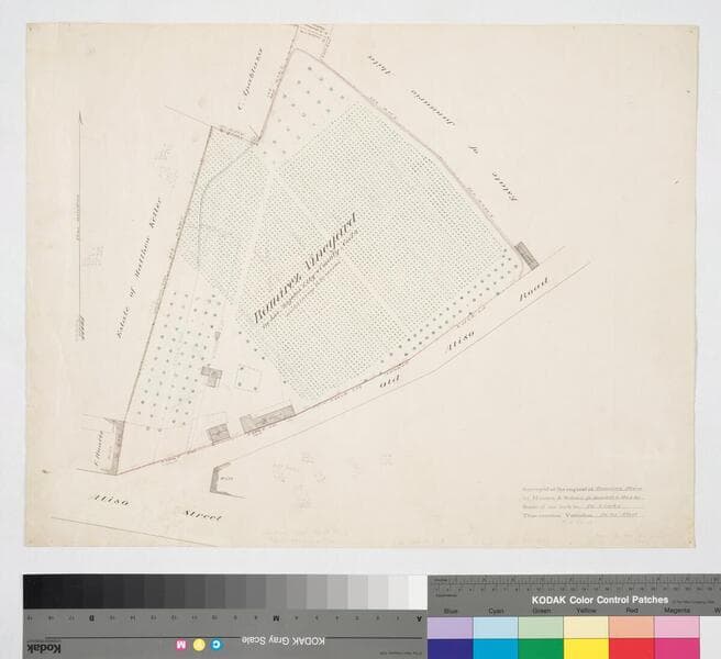 West from Soto St. past Boyle Ave. along Stevenson Ave., also showing part of Block 58, with color highlighting, parcel owners, courses, acreage, distances; pencil annotations, hachures, calculations. Table of courses, distances for Sarah H. Higgins parcel. Alt title supplied by cataloger.