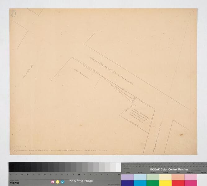 Showing structures, frontages, lot owners; colored ink; hachures; courses, distances (Marked #9). Paper watermark: Royal Linen Ledger. . Title supplied by cataloger.