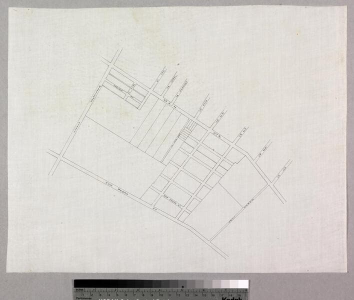 Showing structures; lot owners; distances. Depicts proposed extension of Second St. as per Ordinance of May 12, 1884 . [see: Map 724 Weinshank Tract, May 6, 1891; Map 729 circa 1891; Map 736 "Weinshank Tract" Sept. 27, 1894]. Title supplied by cataloger.