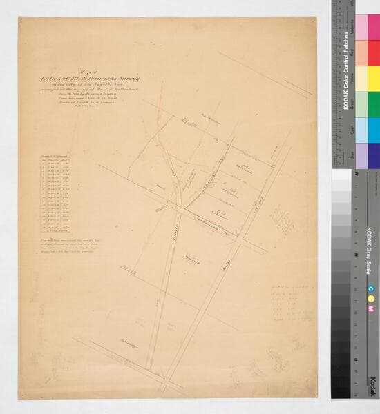 Block 59, Hancock's Survey, showing other lots; Soto St. west past Boyle Ave., north from Stevenson Ave.. Red & black ink, showing acreage, tract & lot numbers, courses, distances. . Title supplied by cataloger.