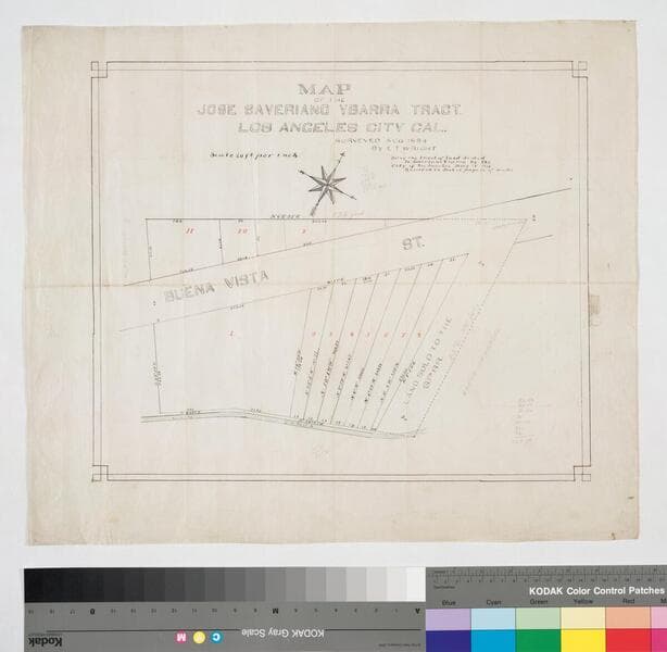 Buena Vista St., showing dwelling house; color highlighting, Main Zanja; distances, bearings; pencil annotations. Alt title supplied by cataloger.