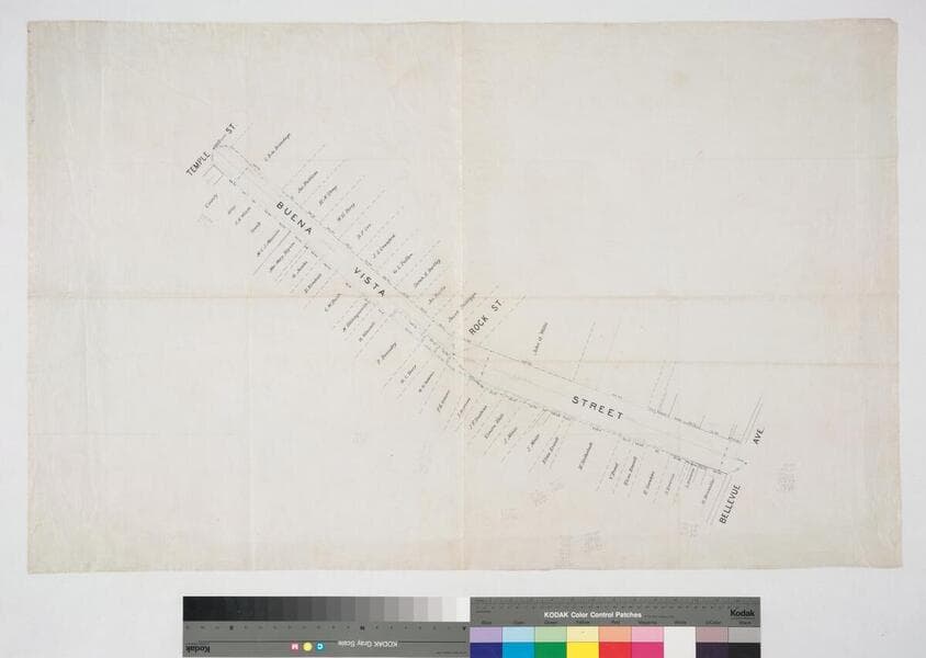 Copy of previous map. South from Mission St., including surface detail and parcel owners. Shows courses, distances, acreage; title histories; color highlighting. Surveyed at the request of J. W. Wolfskill. Title supplied by cataloger.