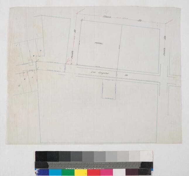 Near Macy St. to Commercial St., Olivera/Sanchez St. and Plaza to Alameda St. and Negro Alley, showing structures, lot owners around Plaza & Negro Alley; courses, distances. Verso: Los Angeles Extension & Negro Alley 1888. Alt title supplied by cataloger.