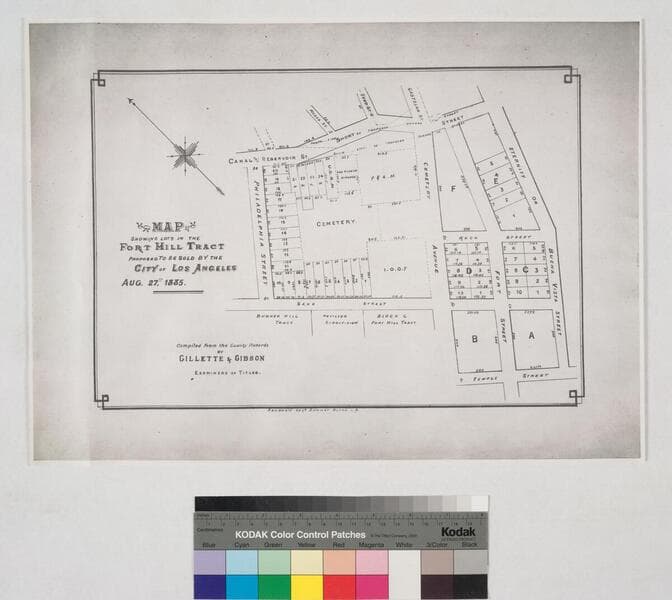 Castelar to Buena Vista St., Bellevue Ave. (Short St.) to Sand St., showing structures, lot owners, with notes; courses, distances, survey history. Paper watermark: Southworth’s 1882 Linen Bank. Alt title supplied by cataloger.