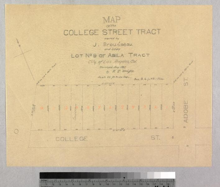 Buena Vista to Adobe St., from north of College St. north past Bernard St., showing structures, vegetation, some lot owners, with title history (1857-1882); color highlighting, numbered tracts & lots, courses, distances, pencil annotations. Affixed: news clipping of legal notice re: this tract dated June 10, 1882. Surveyed at the request of John Bernard. Alt title supplied by cataloger.