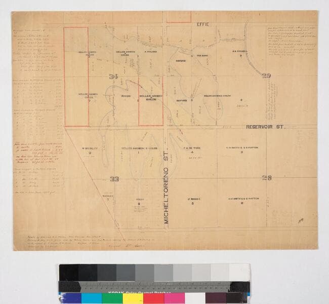 Parcels along Micheltorena Street near Reservoir and Effie Streets, Blocks 28, 29, 33, & 34, Hancock's Survey, showing surface detail, including portions of Blocks 30 & 35.. [Related paper version says it is based on surveys of May 1885 by William Moore and Aug. 13-15, 1885, by Alfred Solano]. Title supplied by cataloger.