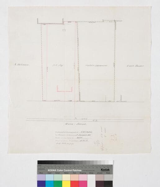 Childs & Mascarel and S.C. Foy parcels [along Main St., showing structures and names of lot owners, with title abstract (1857-1882)] [2 pieces, also including: variant of preceding map]
