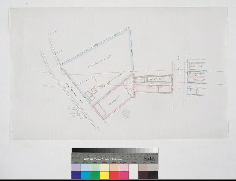 From Los Angeles to Alameda St., showing frontages, lot owners; color highlighting, courses, distances, calculations, survey notes. Includes pencil draft-outline of same map (approximately same dimensions). Title supplied by cataloger.