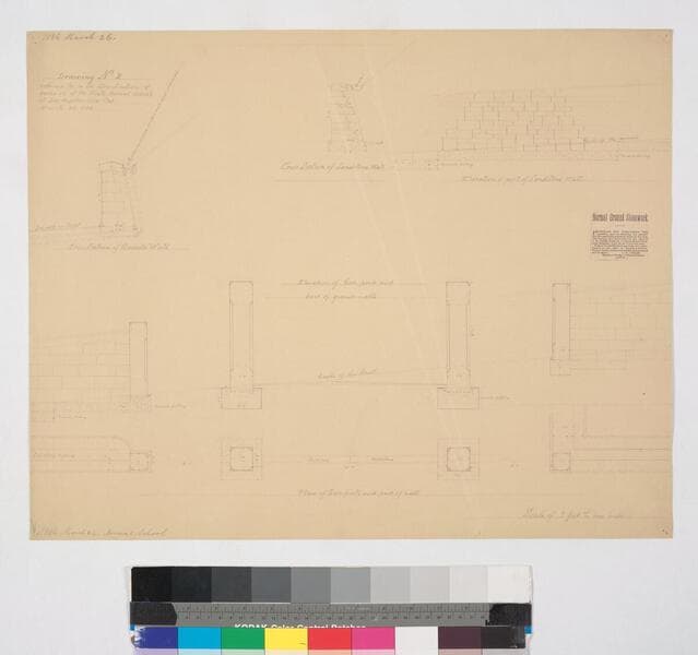 Drawing No. 1 referred to in the specification of walls, etc. of the State Normal School. Structures, footage indicated. Alt title supplied by cataloger.