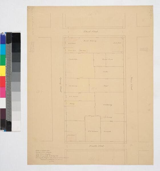 Ord's Survey, delineated from deeds on file, with list of deed transfers; color highlighting; lot dimensions. Third to Fourth St., Main to Spring St., showing structures and lot owners; color highlighting; lot dimensions. Survey requested by G.D. Rowan. Embossed mark on paper: "Duplex.". Alt title supplied by cataloger.