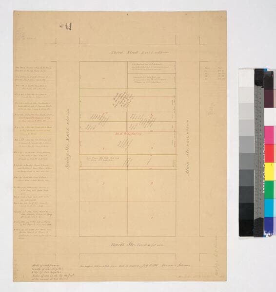 Ord's Survey, Third to Fourth St., Main to Spring St., showing structures and lot owners; color highlighting; lot dimensions. Survey requested by G.D. Rowan. Alt title supplied by cataloger.