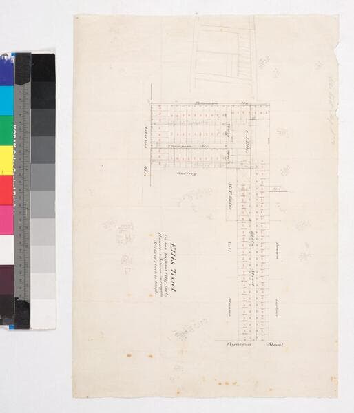 Ellis Tract Map No. 2; Adams St. to Ellis St., Toberman to past Thompson St; color highlighting, parcel owners, courses & distances indicated; pencil calculations . Sketch map draft on verso. Alt title supplied by cataloger.