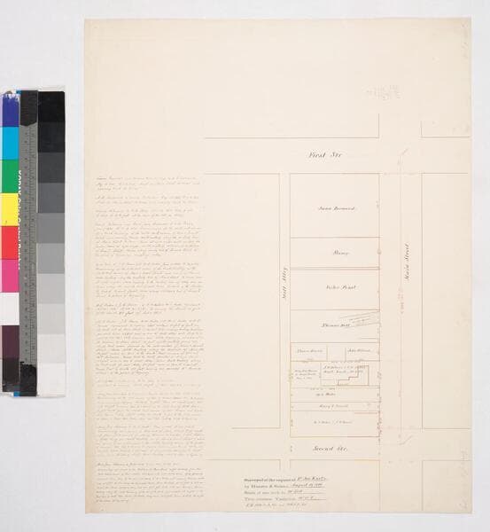 Frontages on west side of Main St. from Second to Third St., showing structures and ; lot owners; color highlighting; courses, distances. Title supplied by cataloger.