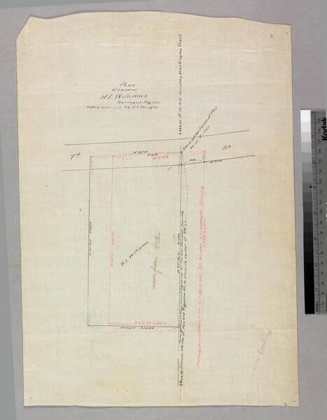 Seventh St. east from Main St., with some parcel owners: Reyes, Kerckoff, Nordholdt . ; Copied by S. S. Watson.. Courses, distances; color highlighting. Alt title supplied by cataloger.