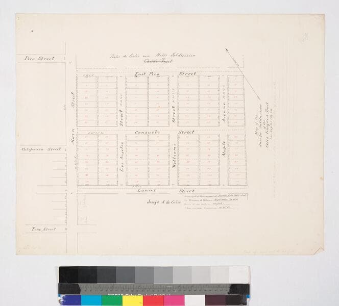 Laurel to East Pico St., from Main St. to Maple Ave.. Courses, distances, calculations & parcel numbers in pencil. Pastor de Celis now Mills Subdivision. [Title info from verso]. Alt title supplied by cataloger.
