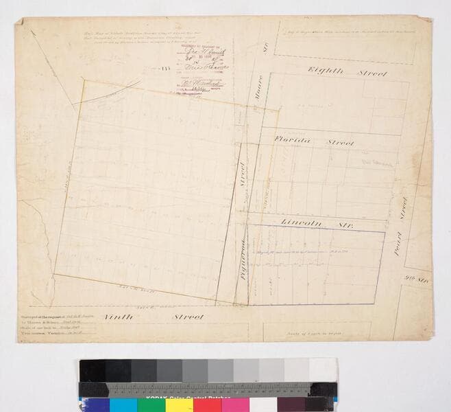 ...lying west of Moore Street along Florida and Lincoln St., from Ninth to Eighth St., west of Pearl and Moore St., with table of allotments, references to partitions with referees' signatures; showing owners of lots, and extension of Eighth St.; color highlighting, courses, distances. . Alt title supplied by cataloger.