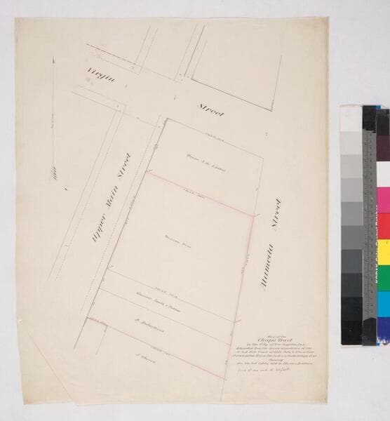 Upper Main St. to Alameda St. south of Virgin St., showing lot owners, courses, distances; color highlights, minor hachures. Alt title supplied by cataloger.