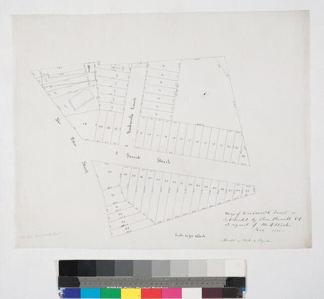 Buena Vista to Adobe St., from north of College St. north past Bernard St., showing structures, vegetation, some lot owners, with title history (1857-1882); color highlighting, numbered tracts & lots, courses, distances, pencil annotations. Affixed: news clipping of legal notice re: this tract dated June 10, 1882. Surveyed at the request of John Bernard. Alt title supplied by cataloger.