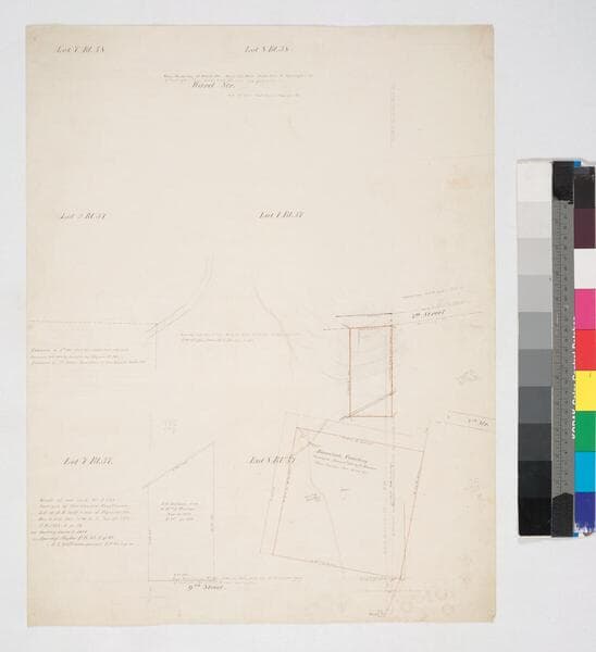 Seventh to Ninth St., west of Figueroa St., with title history (1875-1879), some distances. Verso: sketch map of unidentified parcel divided into 10 sections: sec. 8 subdivided with pink lines; calculations. Title supplied by cataloger.