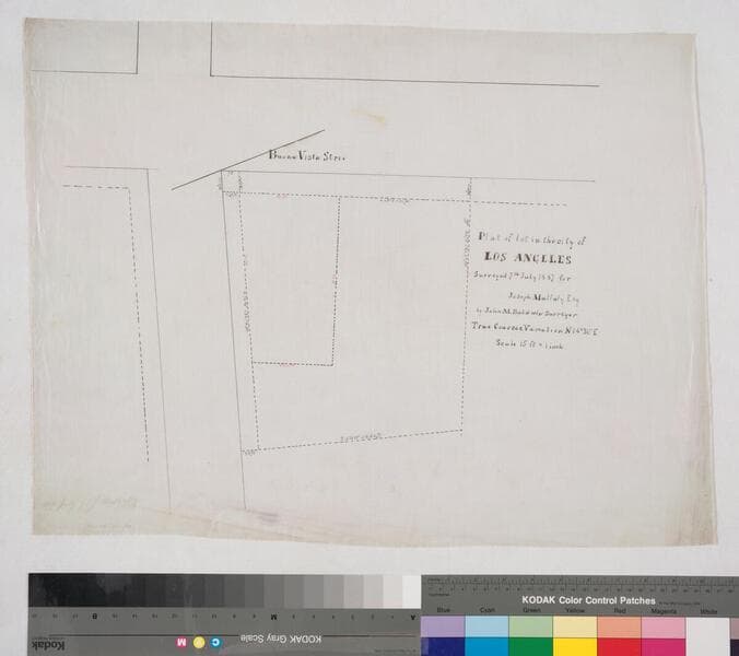 Enlarged variant of part of preceding map: between Los Angeles St. and Zanja No. 5. Color highlights, fences, walls; courses, distances indicated. To be conveyed to Bilderrain & Rivera; ; Mrs. Rump adjacent. Alt title supplied by cataloger.