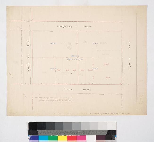 Eighteenth (Ocean) St. from Figueroa to Georgia Bell St.. Copy of Map Book 3 p. 6 City Engineer's Office, shows lot owners, bearings, distances; color highlighting; pencil calculations. Title supplied by cataloger.