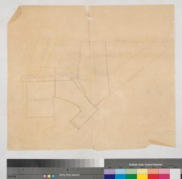...explanatory of Abstract of Title; along road to Mission San Gabriel, with deed transfers noted within parcels. Paper watermark: Royal Linen Ledger. Color highlighting; courses, distances. [see also Map No. 677]. Alt title supplied by cataloger.