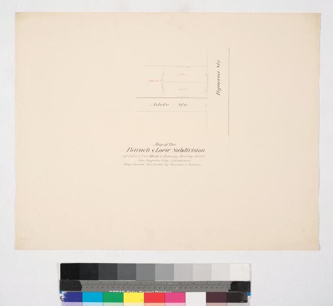 belonging to Andrew Glassell, Esq., with Block 16, Park Tract, Diamond St. from Figueroa to Canal St.; colored inks, courses, distances; block & parcel numbers; shows part of Park Tract. Paper watermark: Royal Linen Ledger. Alt title supplied by cataloger.