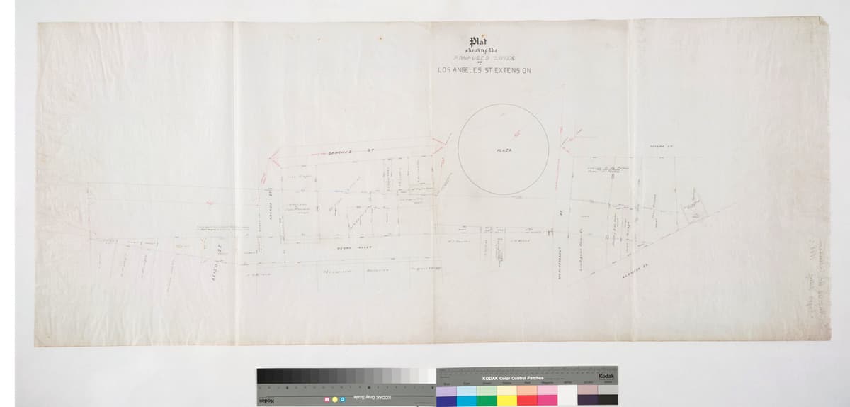 Within fastened document, "Los Angeles Street Extension..." maps numbered No. 1- No. 15, with color highlighting; showing courses, distances, bordering parcel owners from Plaza/Olvera St./Negro Alley to Alameda St./Rimpau. Alt title supplied by cataloger.
