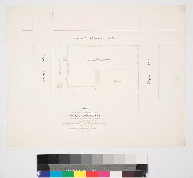 P. 4 of stapled Rowan deed document, parcels between Flower & Hope streets, along Court House street, with distances, title info, parcel numbers and owners: Shorb, Green, Chaffey, Burns & Rowan. Alt title supplied by cataloger.