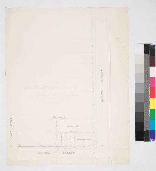 Court House St. from Flower to Hope St., showing structures, lot owners; color highlighting, courses, distances. Paper watermark: Southworth’s 1882 Linen Bank. Alt title supplied by cataloger.